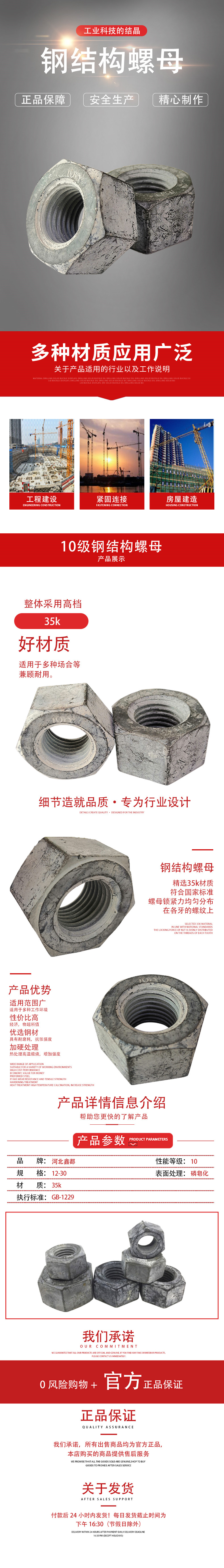 河北鑫都紧固件有限公司已有多年的紧固件生产经验,是一家从事集科研、开发、生产、销售、服务于一体的企业。多年来,我公司培养了一大批具备专业知识及创新型技术人员和生产骨干,凭借先进的管理方式,雄厚的技术力量,现代化的加工和检测设备及科学的工艺流程,不断地向用户提供拧得紧、固得牢、高质量、高标准的产品。公司主要生产8.8级、10.9级、12.9级高强度螺栓、螺母、大六角头钢结构连接副(可来料加工);国标(GB)、德标(DIN)、美标(ANSI)、英标(BS)、日标(JIS)、国际标(ISO)等标准,各类异型件、非标件(来图/来样)等系列产品。